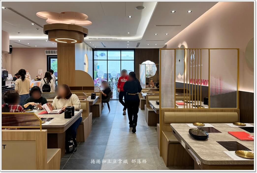 整體是統一的品牌色調,粉色系牆面搭配金色元素,有點優雅,但又不會太少女,反而多了一點輕快感。再加上櫻花感的日系氛圍,整個空間清新又溫暖,坐下來就會想說,好,那我慢慢吃。