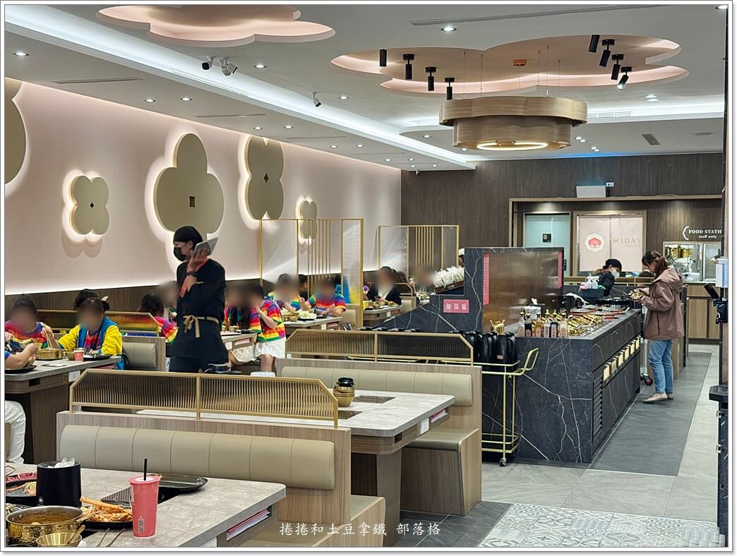 桃金鍋物 楠梓藍田門市,新店地點在藍田路1058號上,佔地很大,門面亮到你經過會忍不住多看兩眼。而且桃金鍋物也不是只想認真賣火鍋而已。經典火鍋配自助吧吃到飽是基本款,他們直接把自家餐飲集團的「桃金嶼」茶飲跟「卷卷烘焙」一起搬進店裡,把街邊手搖飲的概念原地升級成室內版。