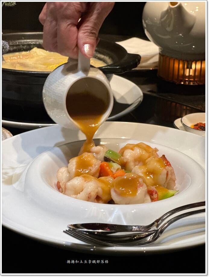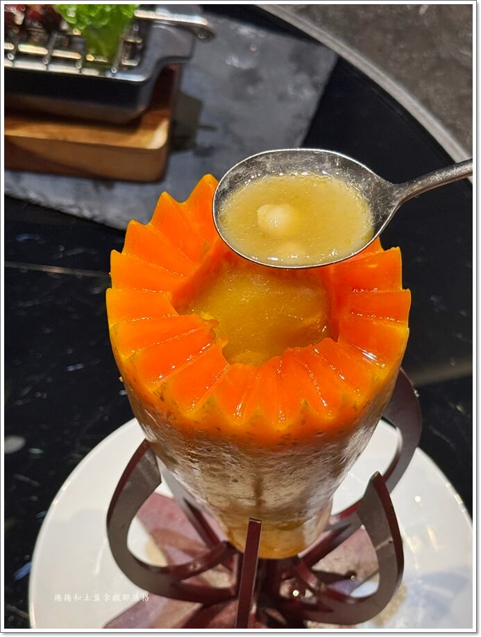 這道菜長得非常優雅,主廚挑了美濃 1.2 公斤、七分熟的木瓜當容器,裡面塞滿豬腱肉、南北杏、還有很高級的日月魚(一種貝類)跟魚翅。