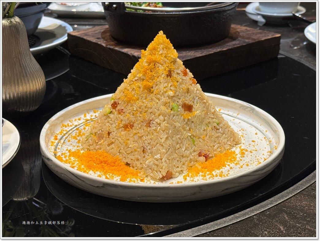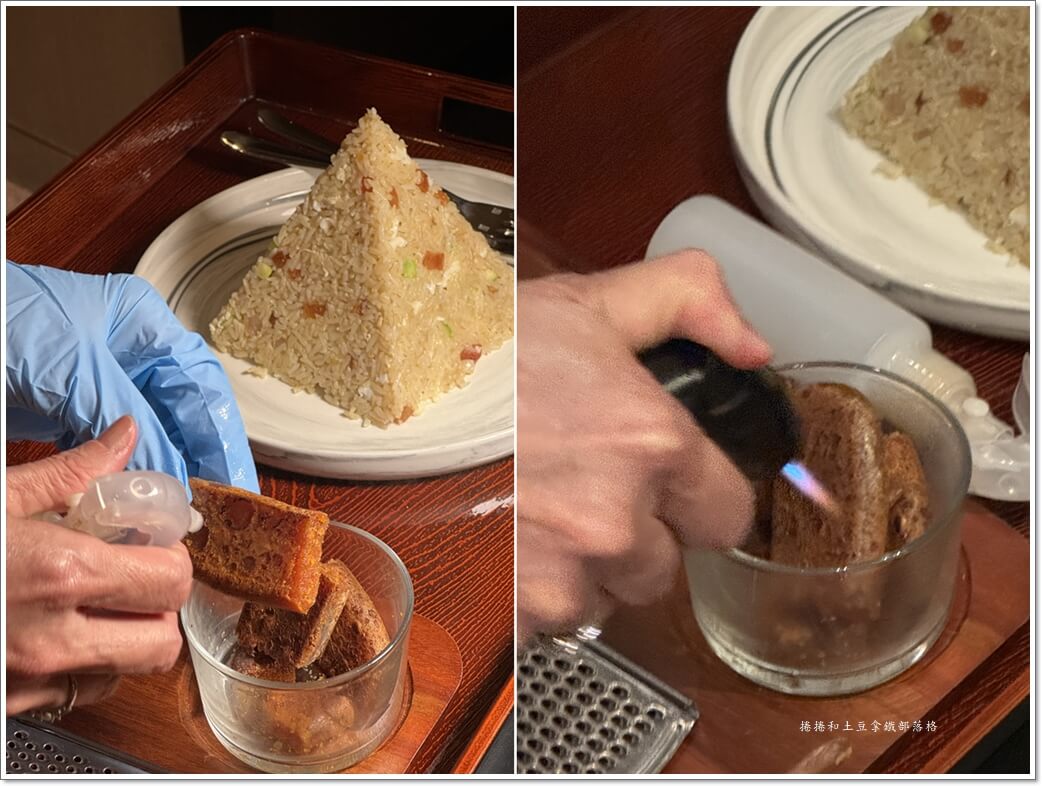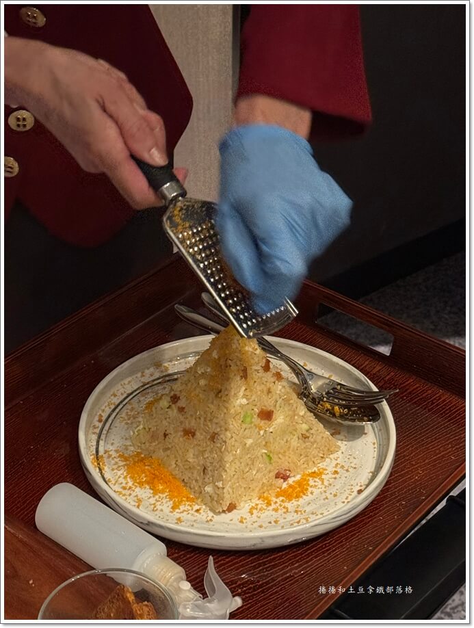 配料有干貝絲跟蝦仁,最後神來一筆桌邊服務刨上高粱酒醃過的烏魚子。