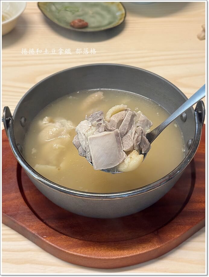 最後一定要喝那碗香濃白蒜雞湯。白蒜的香氣很厚,很捨得用料,滿滿的蒜頭,但不嗆,湯裡竟然還有小干貝一起熬,難怪味道這麼圓潤順口。雞肉還特別挑選公雞,肉質更Q彈結實一些,這鍋真的滿滿的用心。