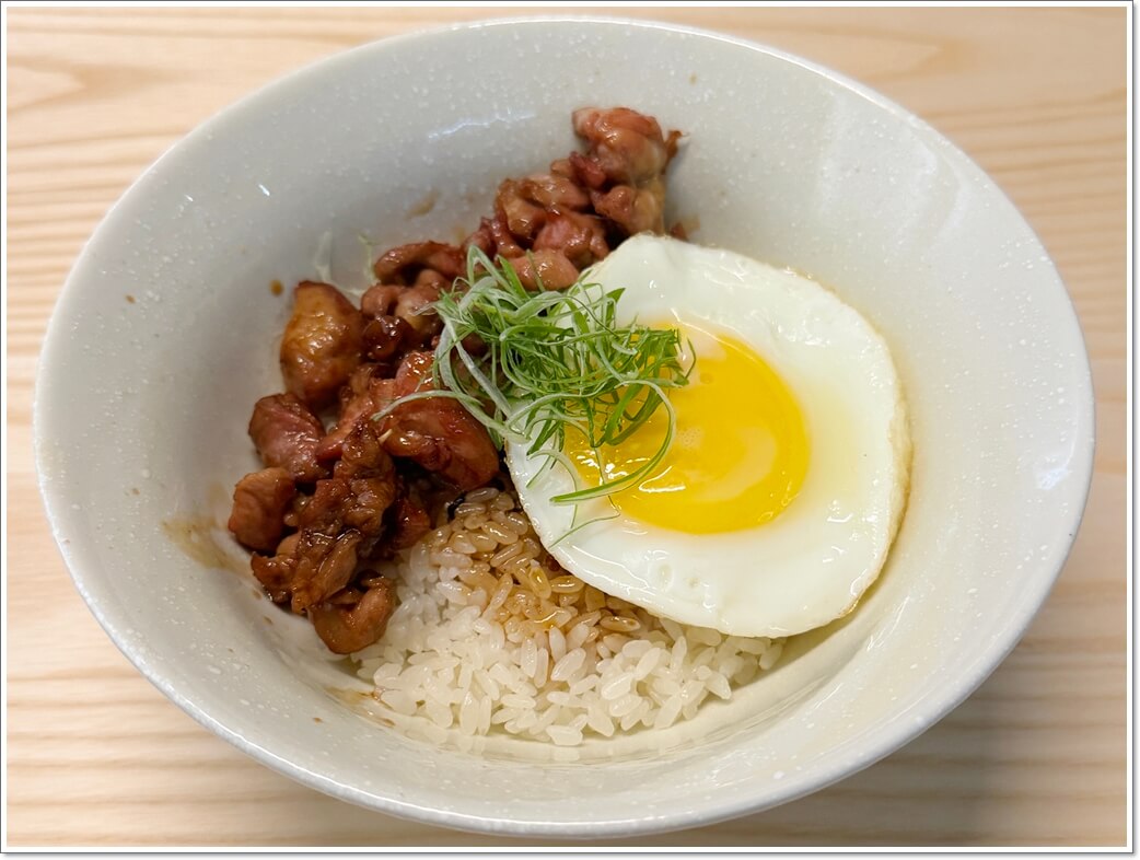 燒鳥蓋飯一上桌,看起來很平常,但真正好吃的地方在那個瞬間。醬汁帶一點甜味,不濃不膩,剛好裹住雞肉。半熟荷包蛋一戳開,蛋液流下來,和醬汁一起滲進白飯裡。會不知不覺多扒幾口,原本只是想收尾,結果碗很快就見底。