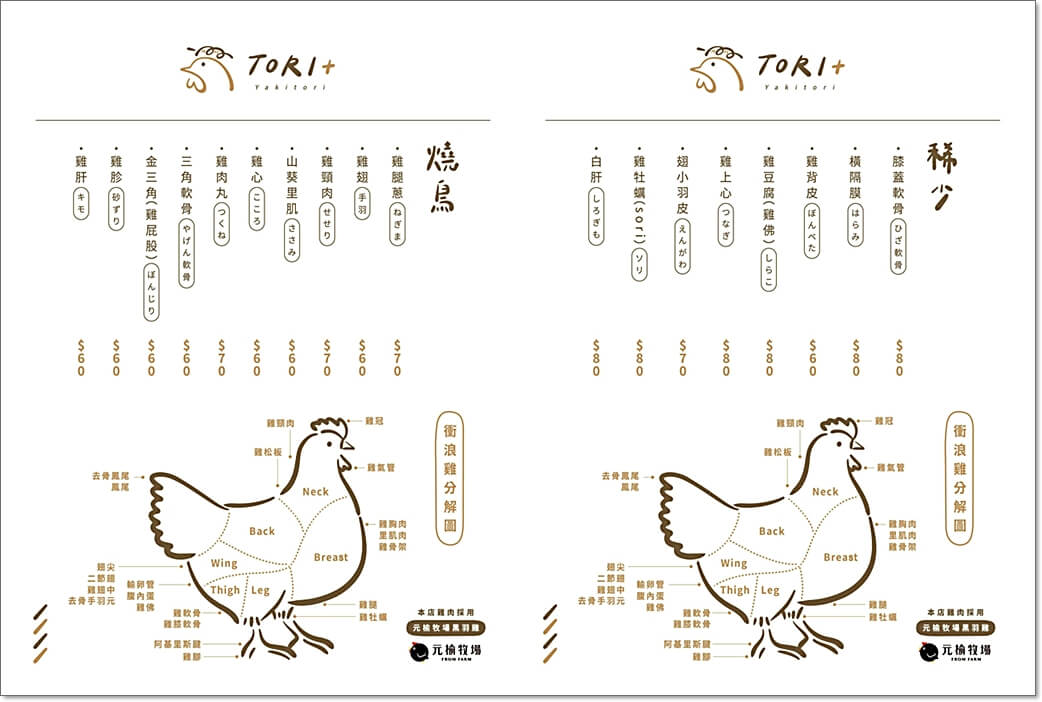 在這裡點菜,妳會突然覺得自己很博學,好像在上一堂雞肉解剖課。因為菜單上的部位也太多選擇了吧,不是一般的雞腿、雞翅、雞軟骨而已,還有少見的 「燈籠」(提燈)、雞頸肉、橫膈膜、雞小羽皮、雞牡蠣…等。一堆你可能這輩子都沒聽過、甚至不知道雞身上有的部位。