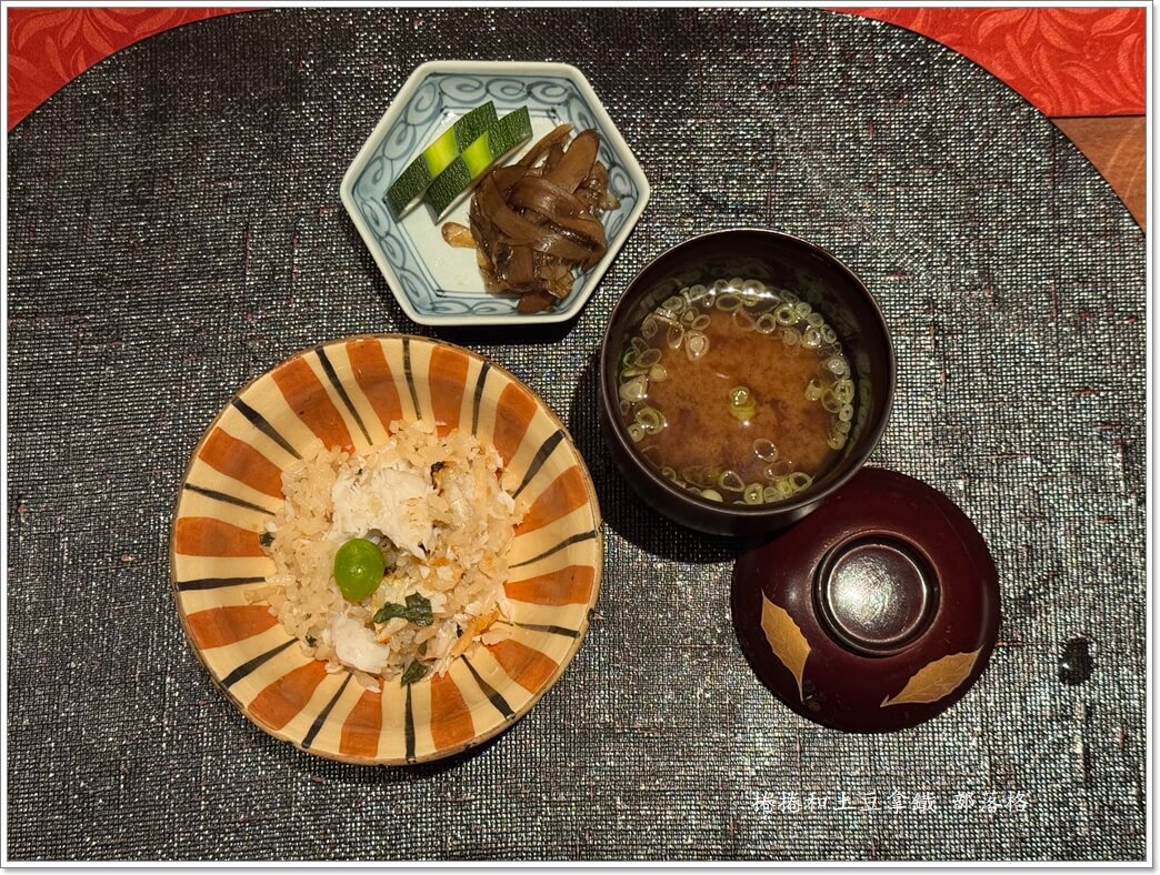裡面有 白鯧魚、烏魚子、還有綠色的新銀杏。光看這個組合就知道,它不只是飯,而是直接把「日本秋天」打包送到你嘴裡。烏魚子的鹹香跟白鯧的細嫩在米飯裡融合,每一口都充滿大海的味道;銀杏則像小巧的驚喜,沒有苦韻很清爽,提醒你四季真的在轉換。最後再用 大葉做提香,整鍋飯吃起來越扒越涮嘴。
