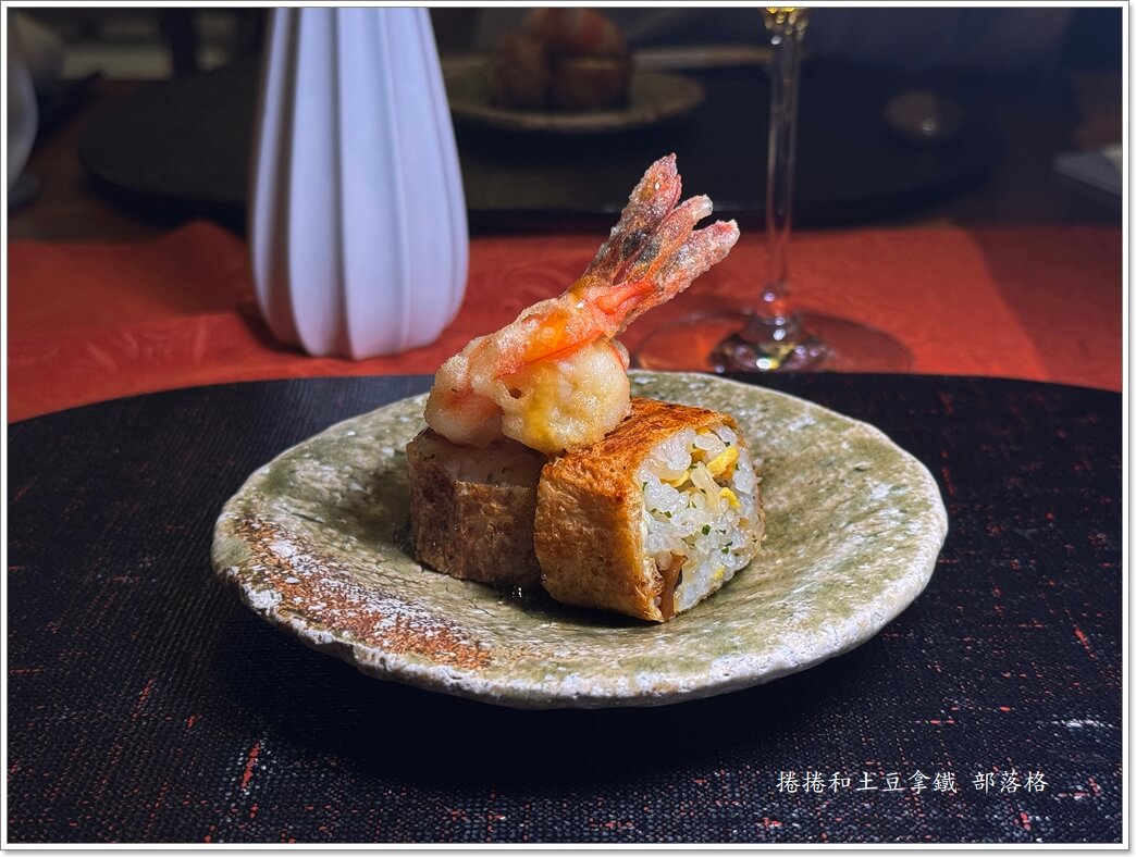 更浮誇的是,豆皮壽司上面直接躺了一隻 澎湖明蝦天婦羅。外表炸得金黃酥脆,一口咬下去,裡面蝦肉飽滿多汁,鮮味直接爆開,那種口感爽度真的完全不輸龍蝦。吃完的瞬間我只想說:這豆皮壽司完全升級成「豪華版海陸大滿貫」了吧!