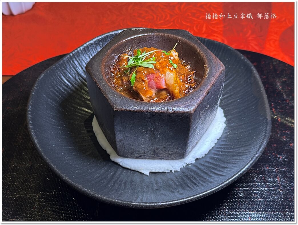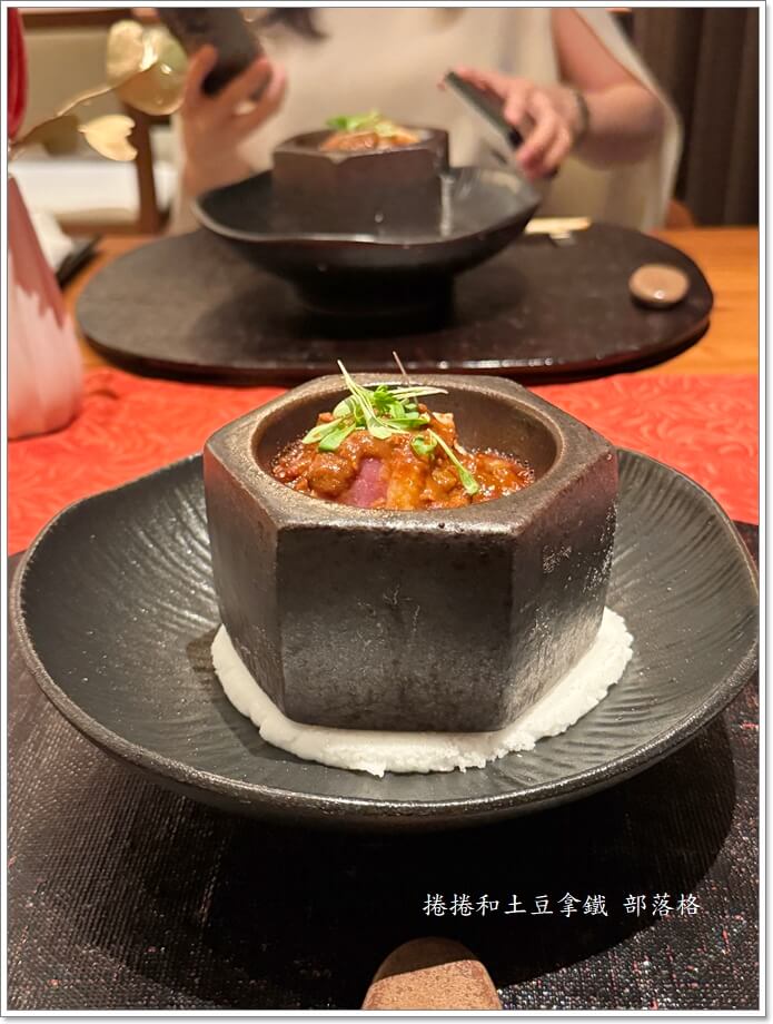 先說這個花生豆腐,真的很厲害,用 葛粉和雲林花生做成的豆腐,口感滑順又帶淡淡香氣,底部搭配的是 澎湖花生,有一點海風味的鹹香,兩者組合起來,味道居然意外地契合,像是海陸戀愛了一樣。再撒上 無花果和魚子醬,甜鹹交錯,視覺和味覺都被抓住,吃一口你會忍不住想說「哇,這也太有心了吧」。