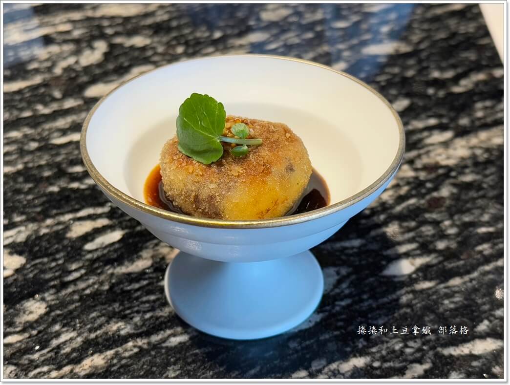 這道料理其實很特別,是用 牛舌碎肉 做成的可樂餅,外層裹上金黃酥脆的麵包粉炸到剛好香脆,裡面卻還保有牛舌的彈性和肉香。咬下去的瞬間,外皮酥脆、內餡柔嫩多汁,還有淡淡的鹹香味,非常下酒。