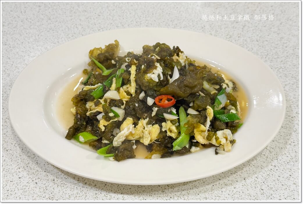 第一道上桌的雨來菇炒蛋,蛋香與雨來菇特有的海藻氣息融合得恰到好處。口感滑嫩中帶點脆感,是非常經典的台式家常菜。