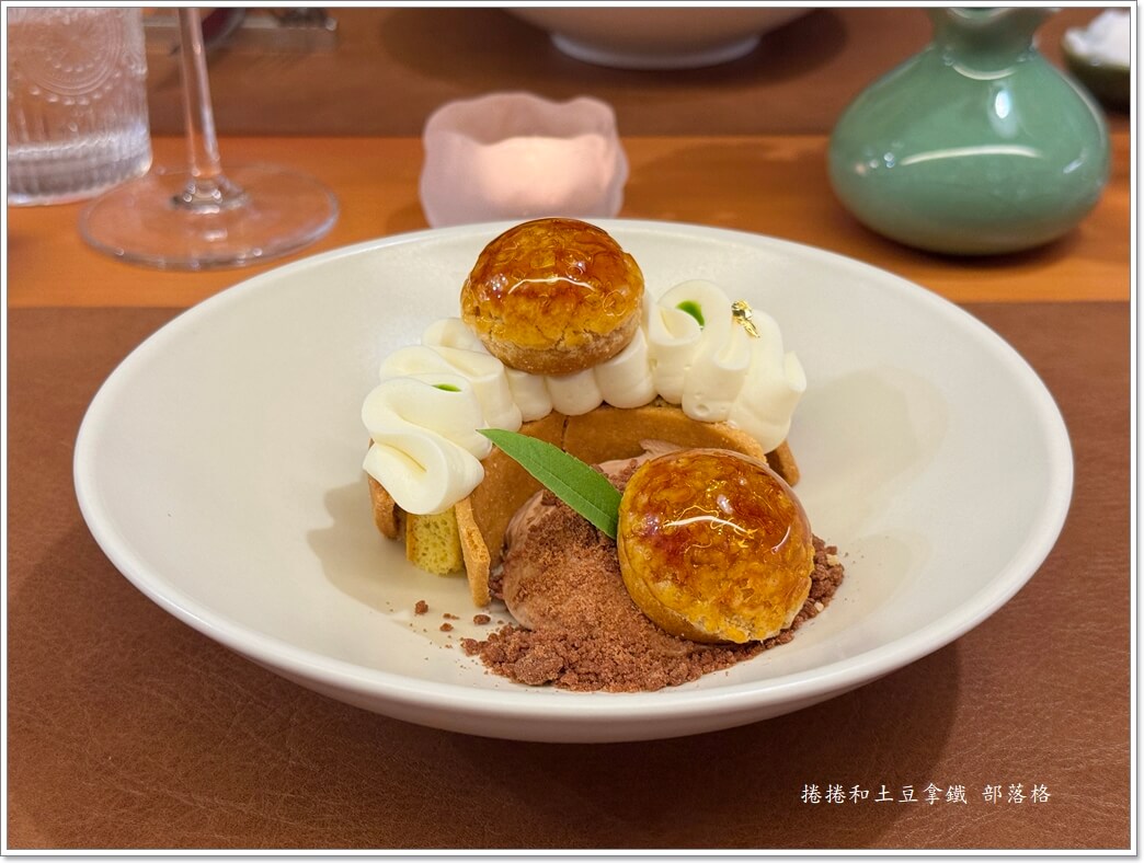 用聖多諾黑的概念來發揮。奶油酥餅夾著馬告杏仁海綿蛋糕和覆盆子醬,焦糖泡芙有烏梅和洛神花兩種口味,旁邊還有 70% 巧克力慕斯和帶胡椒香氣的可可鹹土壤。
