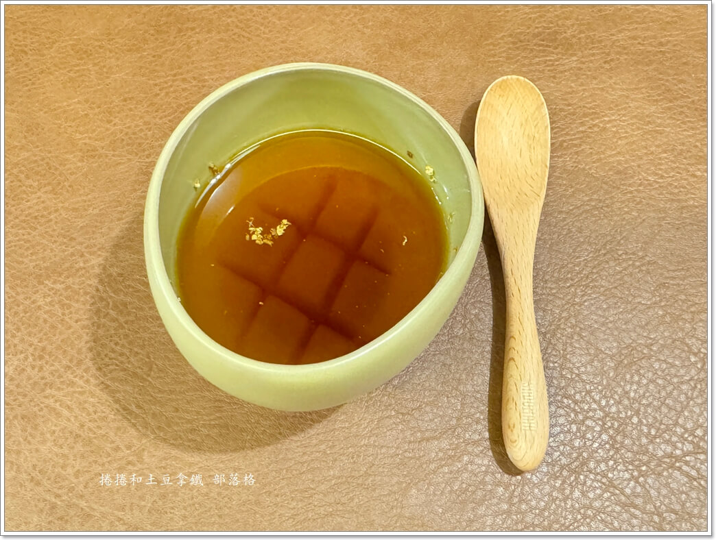 愛玉搭自釀青梅醋和紅冰糖水,灑一點桂花乾,清爽又解膩,讓味覺重新歸零,準備進入正式的甜點