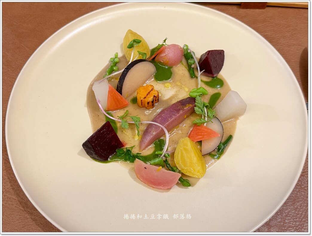 這道「大地之舞」一看就知道很費工。底下是菊芋泥,上面搭菠菜醬汁,接著各種根莖類輪番上場,處理方式都不一樣。奶油橙汁煮的黑大根、紫大根、櫻桃蘿蔔、綠大根,瑪薩拉風味的黃甜菜,鹽焗的紅甜菜,油封碳烤的紅蘿蔔,昆布高湯煮的白蘿蔔,還有清蒸的落葵花。每一樣都很用心,也看得出廚房花了很多時間。