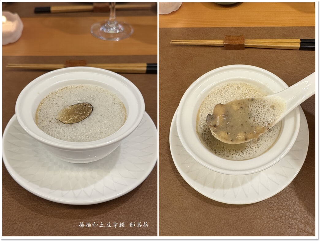 下面是濃厚的松露湯,上面是松露燕麥泡沫,喝起來真的很像在喝一杯松露版卡布奇諾,加上現刨的松露片味道更濃,暖胃又暖心。給予五星好評。