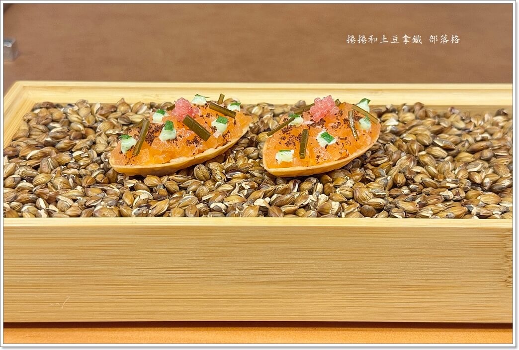 鮮切的石蓮花帶來多汁爽脆感,紫蘇花碎則是細膩的點綴。最讓人錯愕的是那幾顆看似「鮭魚卵」的紅色分子球體,咬下去才知道,它其實是以紅椒調製的分子料理,鹹香、微辣,又帶點迷惑感,讓整道料理在清新之外,多了一點趣味。
