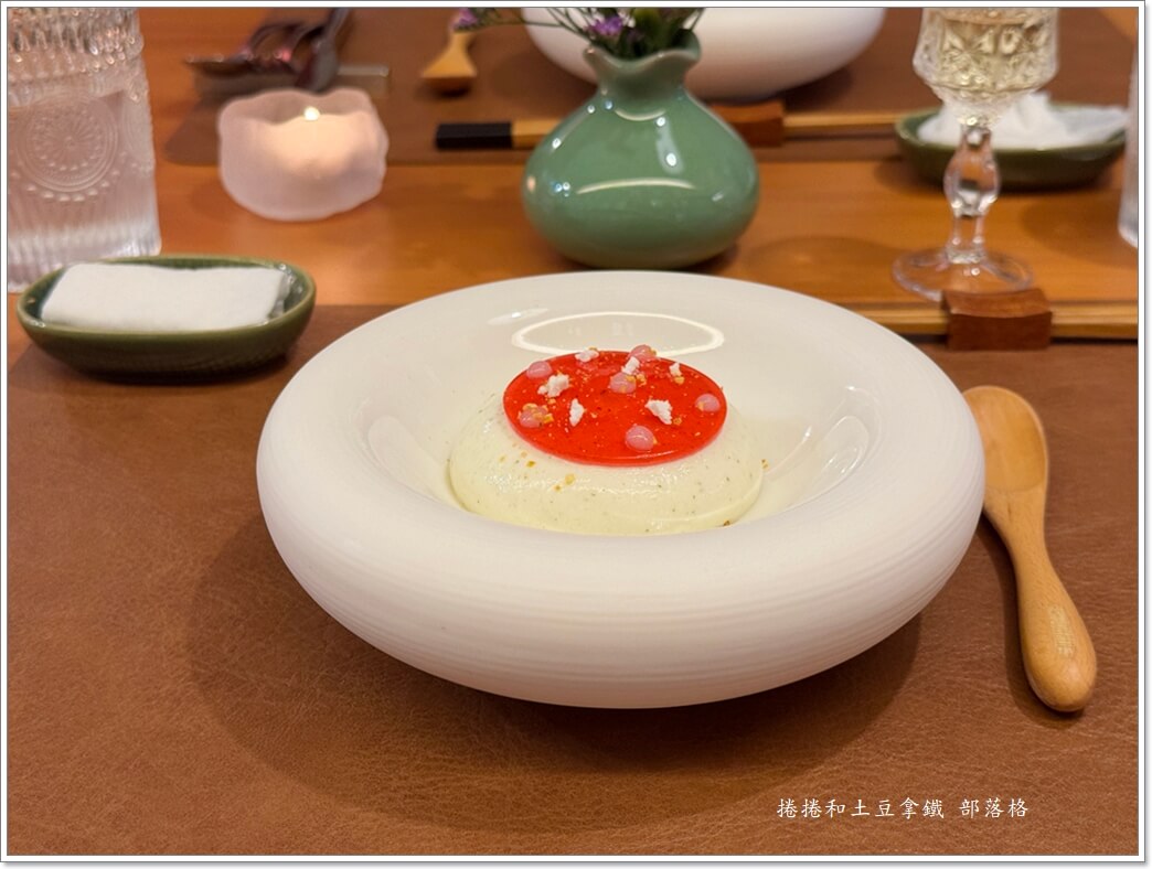 主廚用的是靈芝蛋,打入新鮮的玉米汁,讓蛋液在蒸煮後本身就散發出濃濃的玉米香氣,而這香氣不是來自外層的醬汁或配料,而是直接融進蒸蛋本體裡,成為蛋香與甜香交織的新層次。那種細滑又充滿香氣的口感,完全是我過去從未在蒸蛋裡嘗過的體驗。