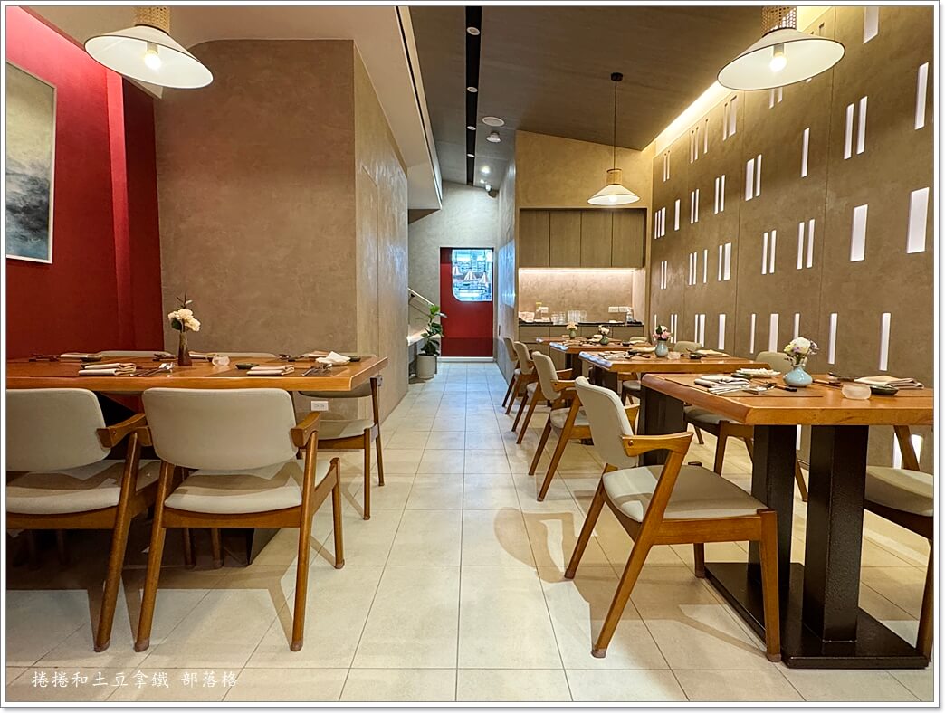 空間是狹長型的,大地色系為主,視覺很舒服,但特地留了一面紅色牆面,讓整體不會顯得太沉。燈光打得很漂亮,會讓人自然放慢節奏,講話變小聲,注意力也慢慢回到盤子上。