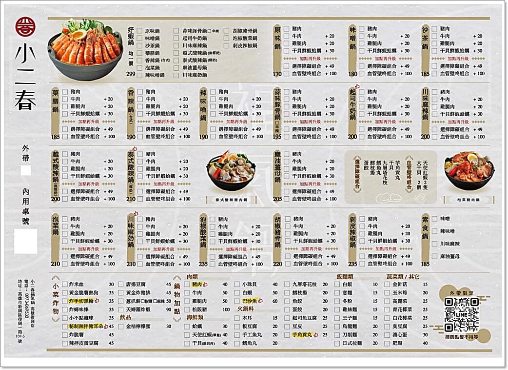 【高雄】小二春福氣鍋 復興店。菜單。尋找湯頭之王。17種湯底 挑戰味蕾新感官。可線上預訂自取。UberEat外送。高雄即食小火鍋