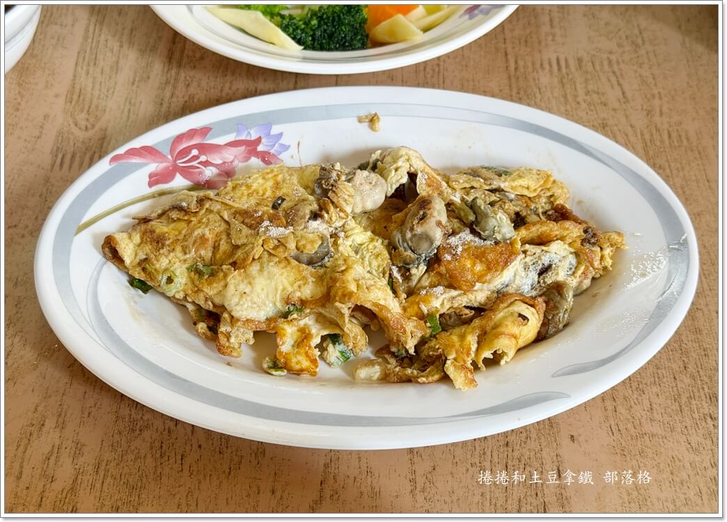 蚵仔蛋。蚵仔蛋外層微微煎得金黃,裡頭的蚵仔鮮甜飽滿,蛋香與海味融合得恰到好處。