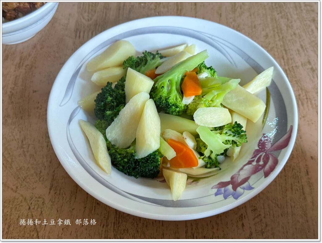 花椰菜+筊白筍。青菜部分選了花椰菜與筊白筍。燙得恰到好處,保有清脆口感,清爽解膩。