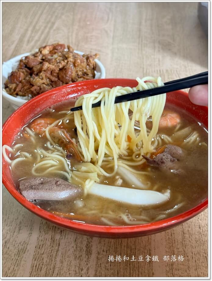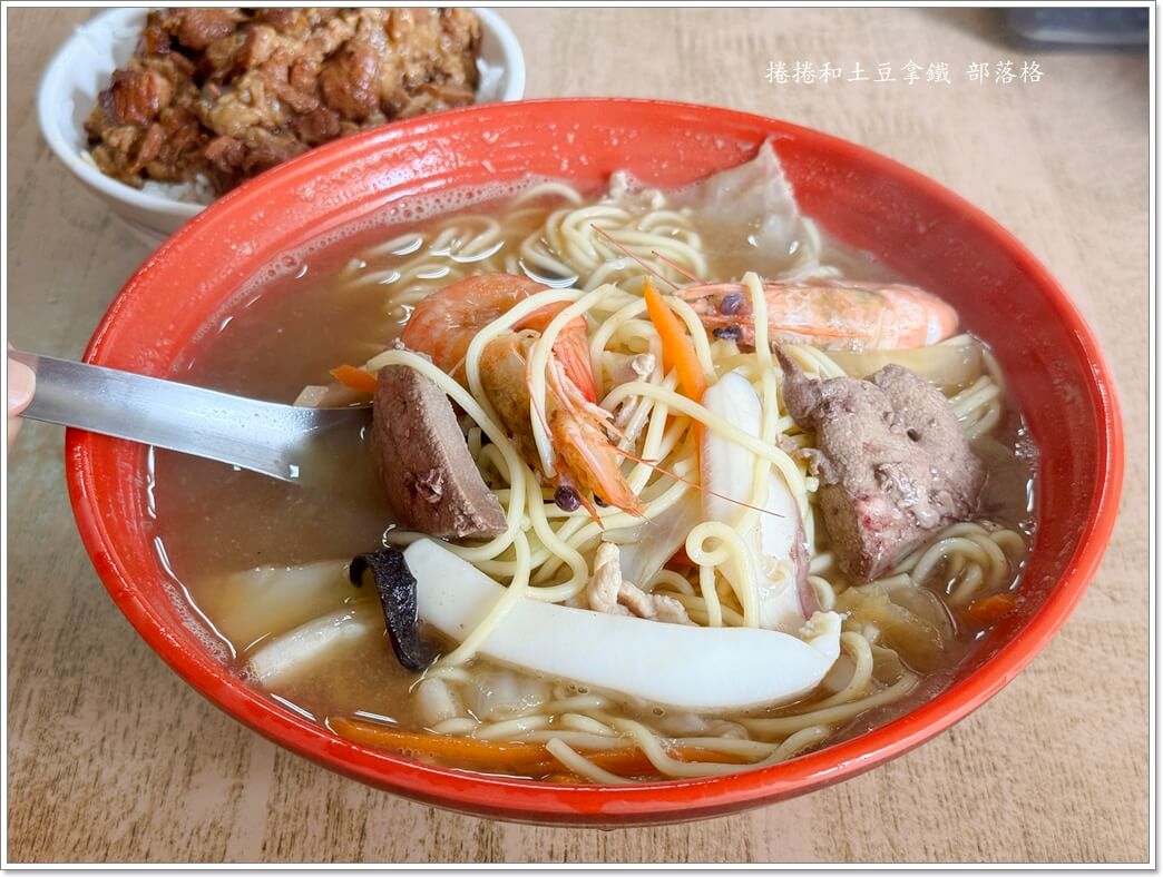 什錦湯麵(油麵)。這碗什錦湯麵選用油麵,麵條滑順帶點彈性,吸附著清甜湯頭的香氣。配料給得不小氣,除了高麗菜外,有蝦子、花枝、豬肝與肉絲,算是古早什錦麵的基本配料,湯頭屬於傳統台式風味,不走重口味路線,而是喝得到甘甜。冷冷的天來上一碗,特別暖胃。