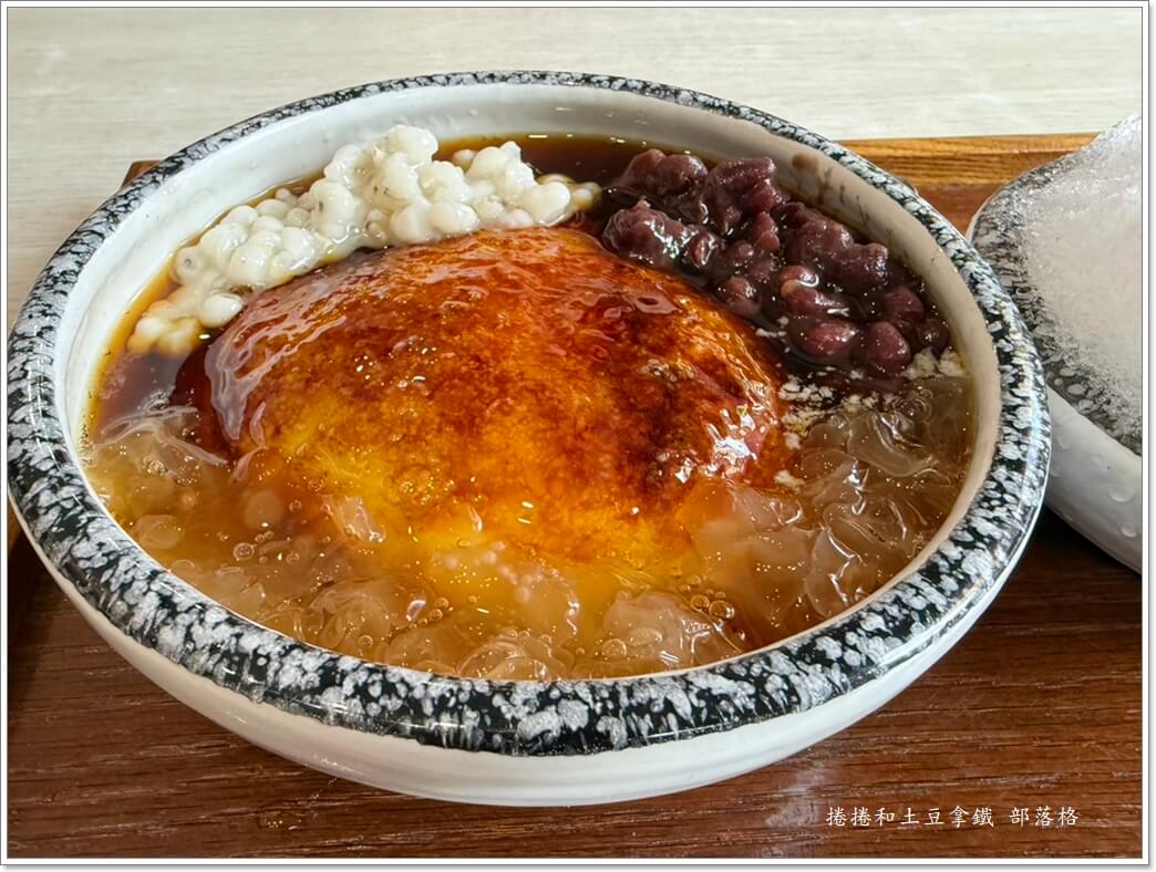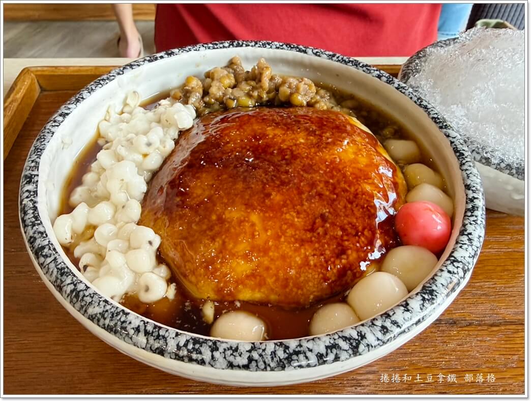 在豆花上炙燒成焦糖,非常的香,焦糖脆脆的口感很好吃,配上豆花真的是絕配。